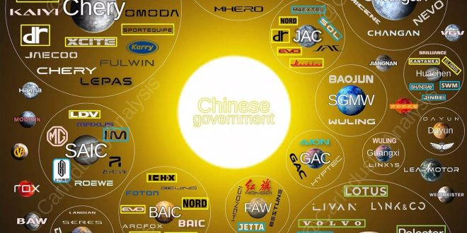 این نمودار که توسط تحلیلگر صنعت، فلیپه مونوز گردآوری شده است، هر خودروسازی را که در حال حاضر به طور کامل یا جزئی متعلق به شرکتهای چینی است، نشان میدهد. از نظر فروش، چهار گروه بزرگ در چین، جیلی (Geely)، بیوایدی (BYD)، چری (Chery) و چانگان (Changan) هستند. دو مورد آخر چون که دولتی هستند، مهماند.