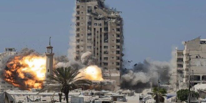 ببینید | لحظه‌ای که بلندترین برج غزه با خاک یکسان شد