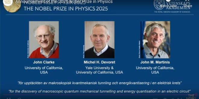 جان کلارک (John Clarke) از دانشگاه برکلی، میشل اچ. دووره (Michel H. Devoret) از دانشگاه ییل، جان مارتینیس (John M. Martinis) از دانشگاه سانتا باربارا برندگان جایزه نوبل فیزیک در سال ۲۰۲۵ هستند.