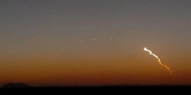ابر بزرگ، نورانی و در حال انبساط در ارتفاع بسیار بالا (هنگام غروب/طلوع) | پدیده گرگ و میش؛ روشن شدن گازهای خروجی توسط خورشید | تأیید پرواز در ارتفاع بسیار بالا (فرا-جوّی)؛ الگوهای مارپیچی ممکن است نشاندهنده مانورهای کلاهک باشد |