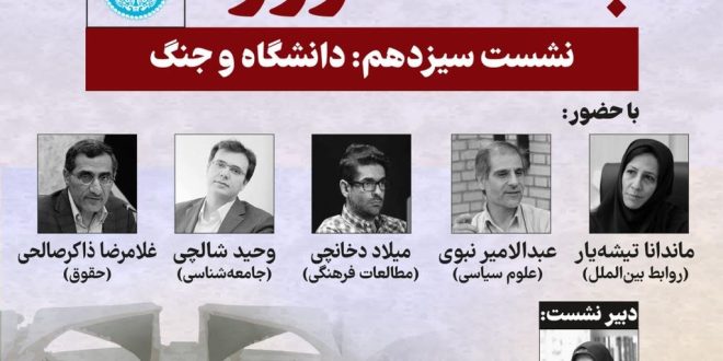 به گزارش خبرگزاری خبرآنلاین به نقل از روابط عمومی انجمن جامعهشناسی ایران، در نشست سیزدهم با موضوع «دانشگاه و جنگ» ماندانا تیشهیار (روابط بینالملل)، میلاد دخانچی (مطالعات فرهنگی)، غلامرضا ذاکرصالحی (حقوق)، وحید شالچی (جامعهشناسی) و عبدالامیر نبوی (علوم سیاسی) سخنرانی خواهند کرد. دبیر این نشست سمیه توحیدلو است.