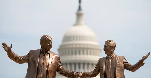 به گزارش خبرآنلاین، یک مجسمه برنزی در شرق «نشنال مال» و مقابل کاخ کنگره آمریکا نصب شده که به روابط دوستانه «دونالد ترامپ» رئیسجمهور ایالات متحده با «جفری اپستین» مجرم جنسی طعنه میزند.