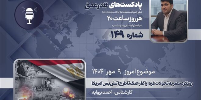 گروه بینالملل خبرگزاری تسنیم ـ یکصدوچهلونهمین شماره از پادکست «در عمق» که به بررسی مهمترین روندها، تحولات و همچنین شخصیتها در غرب آسیا میپردازد، روز چهارشنبه 9 مهر 1404 ضبط و منتشر شد. در این شماره «منصور براتی»، میزبان «احمد بروایه»، کارشناس مسائل مصر و شمال آفریقاست.