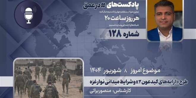 گروه بینالملل خبرگزاری تسنیم ـ یکصد و بیست و هفتمین شماره از پادکست «در عمق» که به بررسی مهمترین روندها، تحولات و همچنین شخصیتها در غرب آسیا میپردازد، روز شنبه 8 شهریور 1404 ضبط و منتشر شد. در این شماره «منصور براتی»، به موضوع طرح ارابههای گیدعون 2 ارتش رژیم صهیونیستی برای اشغال کامل نوار غزه میپردازد که از روز 30 مرداد به اجرا در آمده است.