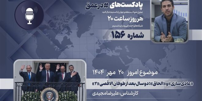 گروه بینالملل خبرگزاری تسنیم ـ یکصدوپنجاه و ششمین شماره از پادکست «در عمق» که به بررسی مهمترین روندها، تحولات و همچنین شخصیتها در غرب آسیا میپردازد، روز یکشنبه 20 مهر 1404 ضبط و منتشر شد. در این شماره «علیرضا مجیدی»، کارشناس مسائل غرب آسیا پیامدهای طوفان الاقصی بر دو پرونده عادی سازی (تطبیع) و الحاق کرانه باختری را بررسی میکند. این اپیزود ادامه شماره 154 پادکست در عمق است و پیشنهاد میکنیم ابتدا به این شماره گوش دهید.