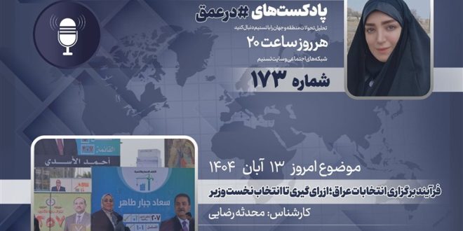 گروه بین‌الملل خبرگزاری تسنیم ـ یکصدوهفتاد‌و‌سومین شماره از پادکست «در عمق» که به بررسی مهم‌ترین روندها، تحولات و همچنین شخصیت‌ها در غرب آسیا می‌پردازد، روز دوشنبه 12 آبان 1404 ضبط و منتشر شد. در این اپیزود «محدثه رضایی» کارشناس مسائل عراق، روند رأی‌گیری در انتخابات عراق و فرایند گزینش رئیس کابینه را بررسی کرده‌است.
