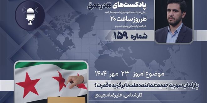 گروه بینالملل خبرگزاری تسنیم ـ یکصدوپنجاه و نهمین شماره از پادکست «در عمق» که به بررسی مهمترین روندها، تحولات و همچنین شخصیتها در غرب آسیا میپردازد، روز چهارشنبه 23 مهر 1404 ضبط و منتشر شد. در این اپیزود «علیرضا مجیدی»، کارشناس مسائل غرب آسیا به نخستین انتخابات پارلمانی در سوریه پس از سقوط بشار اسد را بررسی میکند.