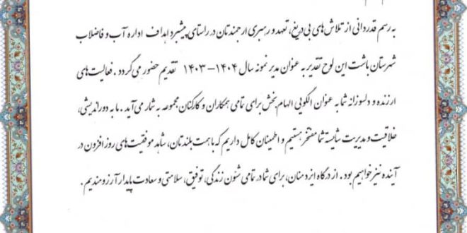 در بخش دیگر از این متن آمده است؛ این تقدیر نشان‌دهنده قدردانی ویژه از تلاش‌های مخلصانه و نقش مؤثر مدیریت و‌کارکنان آبفای باشت در پیشبرد ماموریت‌های شرکت است.