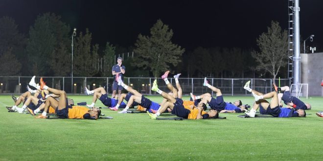 پس از حضور در زمین تمرین، بازیکنان پس از انجام گرمکردنهای معمول، در قالب چهار گروه و با عبور از موانع تعیینشده، تمرین پاسهای کوتاه را انجام دادند. امیر قلعهنویی، سرمربی تیم ملی، در این بخش بر دقت در پاسدهی و اجرای صحیح تمرینات تأکید ویژهای داشت.