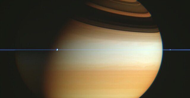 این عکس که به صورت دیجیتالی برش خورده و با رنگهای نمایشی تنظیم شده، نتیجه قابل توجه تلاش ناوارو است. صفحه نازک حلقههای زحل به رنگ آبی و نوارها و ابرها در جو بالایی زحل به رنگ طلایی دیده میشوند. جزئیات حلقههای زحل را میتوان در سایههای بسیار تاریک مشاهده کرد. قمرهای «دیونه»(Dione) و «انسلادوس»(Enceladus) به صورت برآمدگیهایی در حلقهها دیده میشوند.