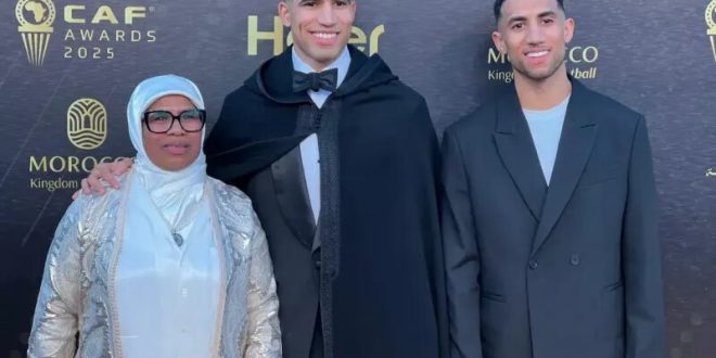حکیمی با پوشیدن «جلابه» سنتی مراکشی و همراهی مادر و برادرش وارد مراسم شد؛ انتخابی که بیش از آنکه یک تیپ باشد، نشانگر پیوند عمیق او با ریشه‌های فرهنگی و هویت ملی‌اش بود. واکنش حاضران هم نشان داد که این نشانه‌ی احترام به میراث مراکش، چه قدر برای مراکشی‌ها دلچسب است.