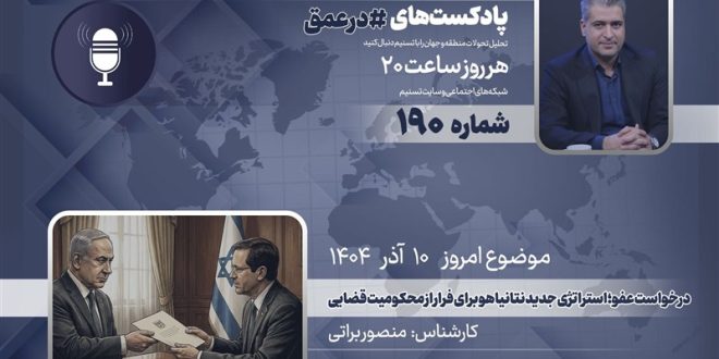 گروه بین‌الملل خبرگزاری تسنیم ـ یکصدونودمین شماره از پادکست «در عمق» که به بررسی مهم‌ترین روندها، تحولات و همچنین شخصیت‌ها در غرب آسیا می‌پردازد، روز دوشنبه 10 آذر 1404 ضبط و منتشر شد. در این پادکست «منصور براتی»، کارشناس مسائل اسرائیل، درخواست رسمی بنیامین نتانیاهو، نخست وزیر رژیم صهیونیستی برای دریافت عفو در پرونده‌های قدیمی قضایی و پیامدهای آن را بررسی می‌کند.