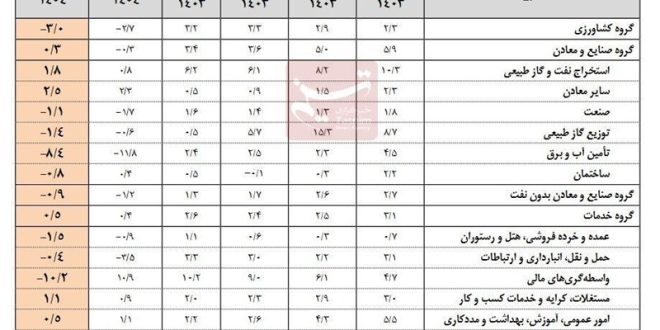 نتایج مذکور حاکی از آن است که در ششماهه اول سال 1404، رشته فعالیتهای گروه کشاورزی رشد 3.0ـ گروه صنایع و معادن 0.3 درصد (شامل: استخراج نفت خام و گاز طبیعی 1.8، سایر معادن 2.5، صنعت 1.1ـ، توزیع گاز طبیعی 1.4ـ، تأمین آب و برق 8.4ـ و ساختمان 0.8ـ درصد) و گروه خدمات 0.5 درصد نسبت به ششماهه اول سال 1403، رشد داشته است.