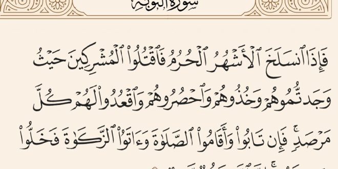 «فَإِذَا انسَلَخَ الْأَشْهُرُ الْحُرُمُ فَاقْتُلُوا الْمُشْرِکِینَ حَیْثُ وَجَدتُّمُوهُمْ وَخُذُوهُمْ وَاحْصُرُوهُمْ وَاقْعُدُوا لَهُمْ کُلَّ مَرْصَدٍ ۚ فَإِن تَابُوا وَأَقَامُوا الصَّلَاةَ وَآتَوُا الزَّکَاةَ فَخَلُّوا سَبِیلَهُمْ ۚ إِنَّ اللَّهَ غَفُورٌ رَّحِیمٌ» توبه/۵