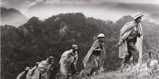 نیروهای ویتمینه در حال برافراشتن پرچم خود بر فراز مقر فرماندهی فرانسه که در دینبینفو به تصرف درآوردهاند