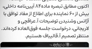 به گزارش خبرگزاری خبرآنلاین، حمید رسایی نماینده تندرو مجلس نوشت: با تعطیلی مجلس انتقادات زیادی متوجه رییس مجلس شد. با توجه به برنامه قبلی تعمدی دانستن تعطیلی منصفانه نیست. اکنون مطابق تبصره ماده ۸۴ آیین نامه داخلی، بیش از ۶۰ نماینده برای اطلاع از مفاد توافق با آژانس و شنیدن …